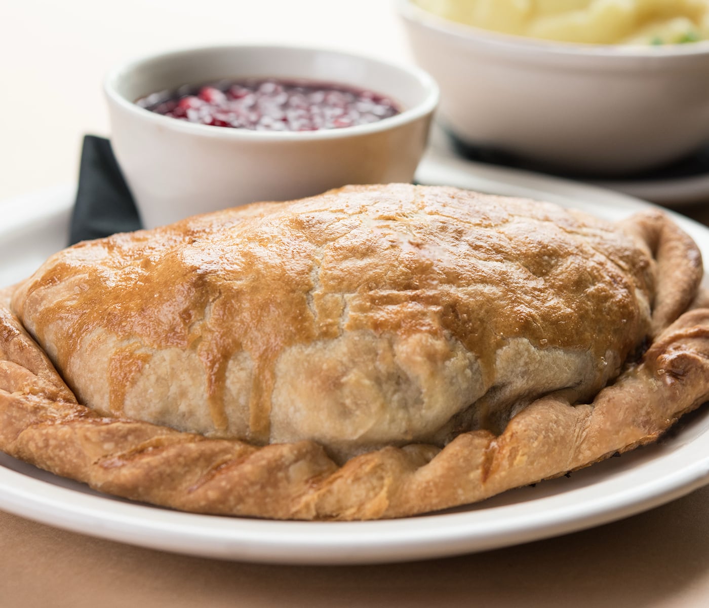 Turkey and stuffing in a homemade crust, mashed redskin potatoes, gravy, homemade cranberry sauce, and a slice of pumpkin pie.